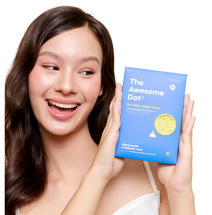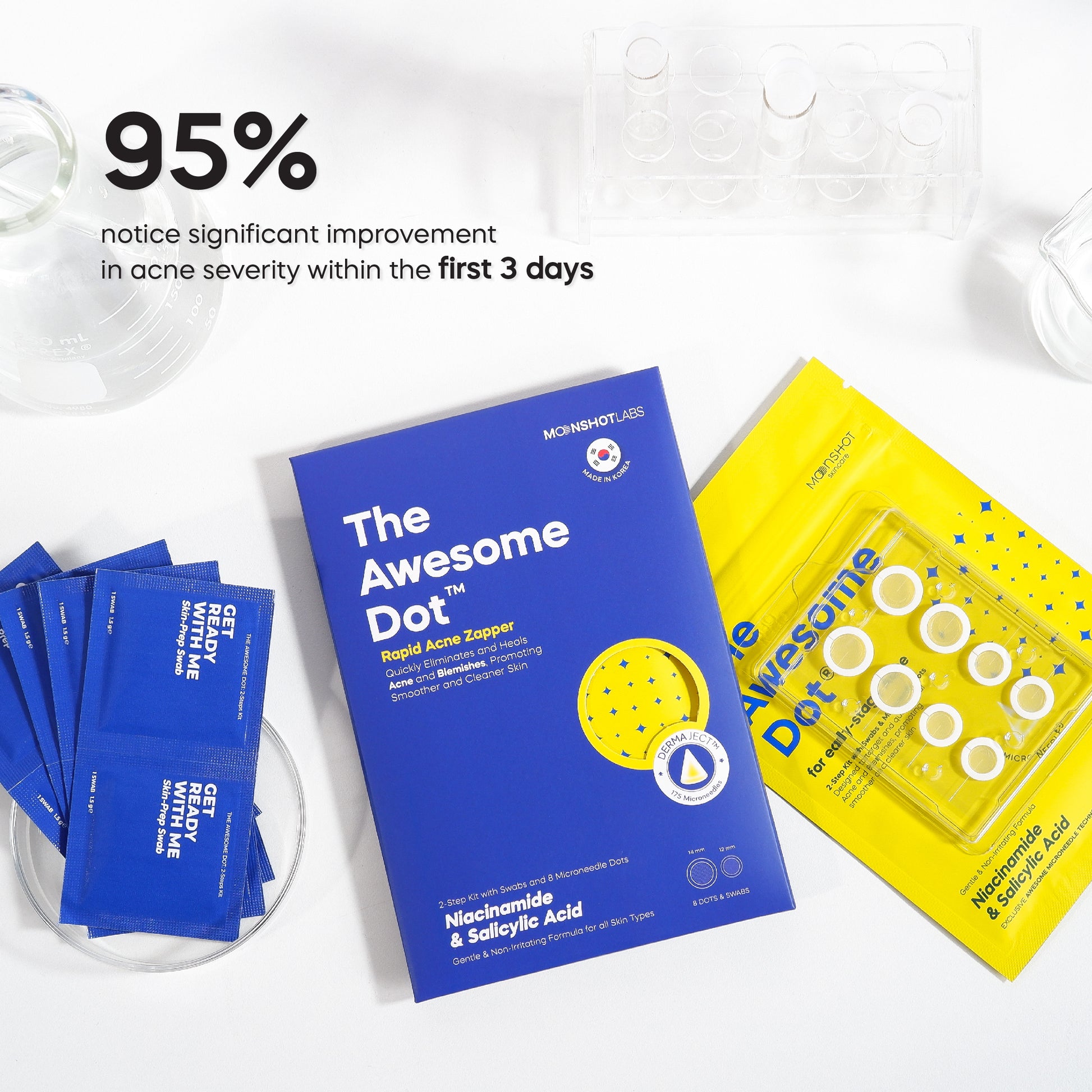 The Awesome Dot is a 2-step acne breakthrough that targets blemishes from the inside out. Start with the Skin Prep Swab to clean and prime. Then apply the microneedle dot — a 173-needle patch that gently penetrates inflamed skin, delivering salicylic acid, niacinamide, Centella Asiatica, and zinc PCA directly into the root of the breakout.
