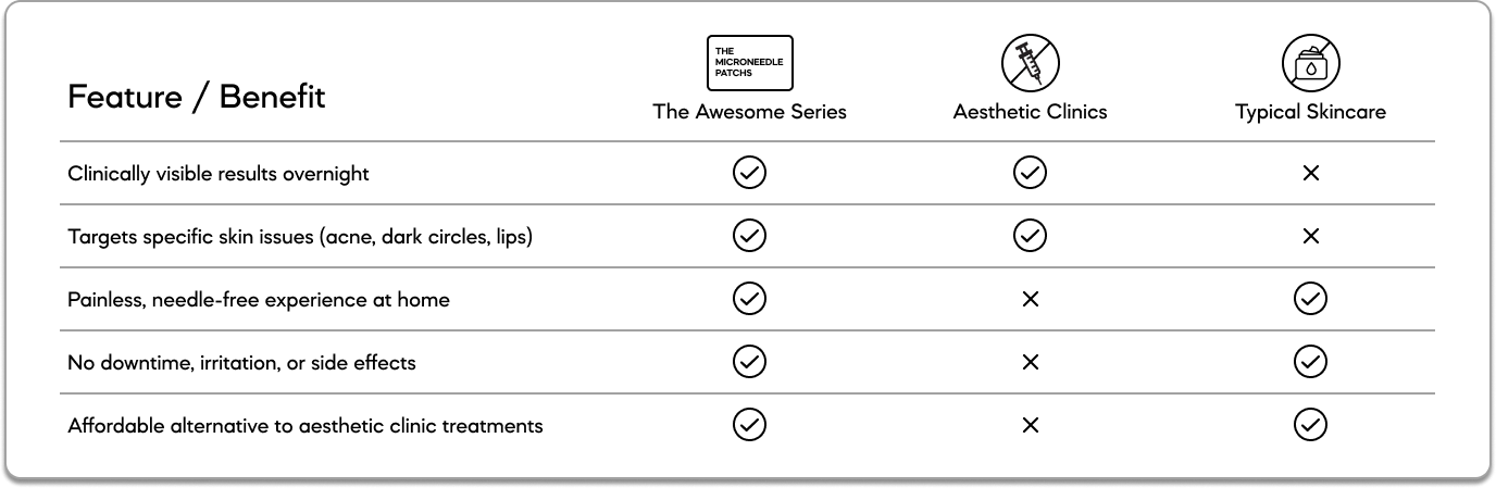 Our products are non-invasive alternatives designed to complement or delay more intensive procedures. While not a substitute for injectables, our microneedle patches deliver clinic-inspired results at home, using ingredients proven to improve skin texture, hydration, and clarity over time.