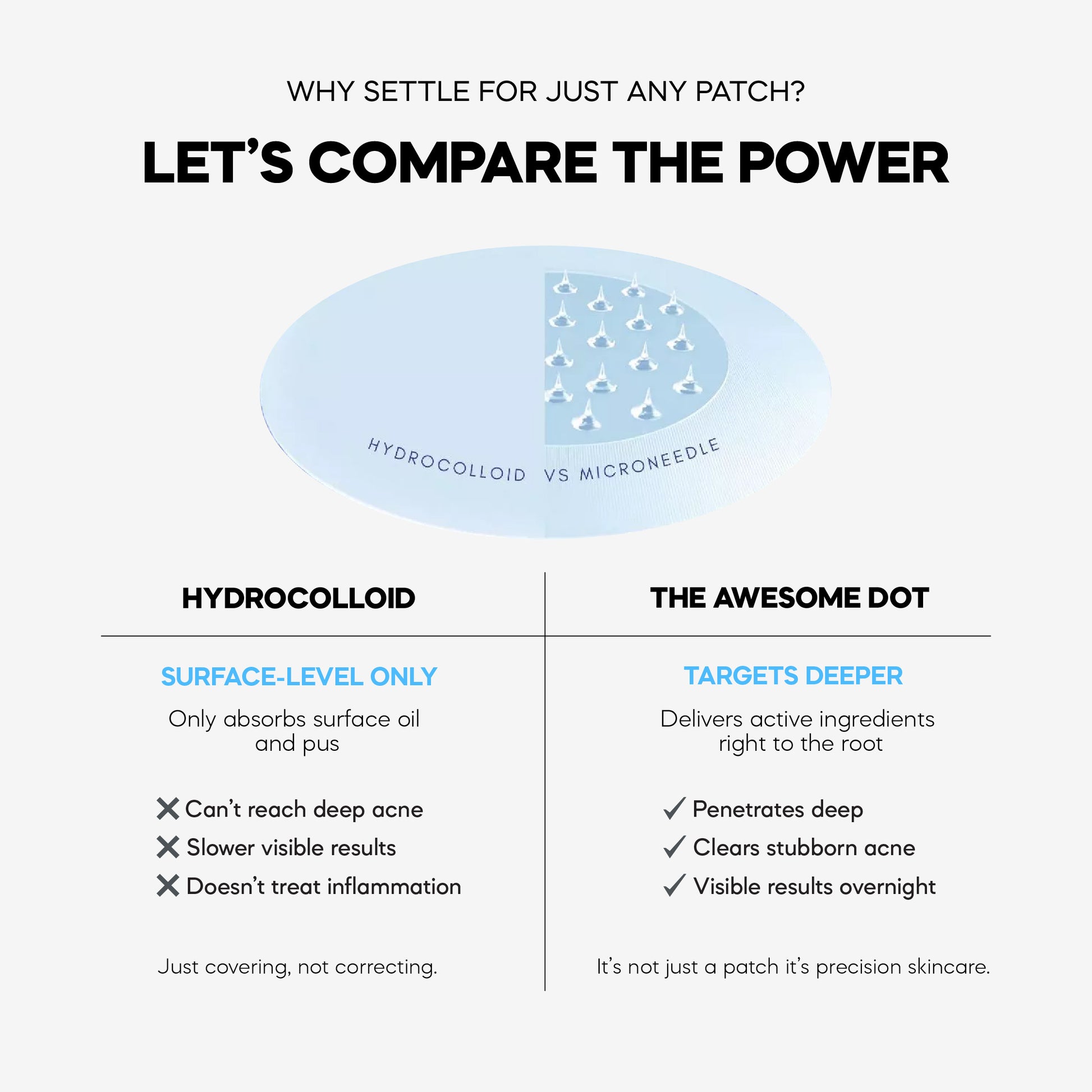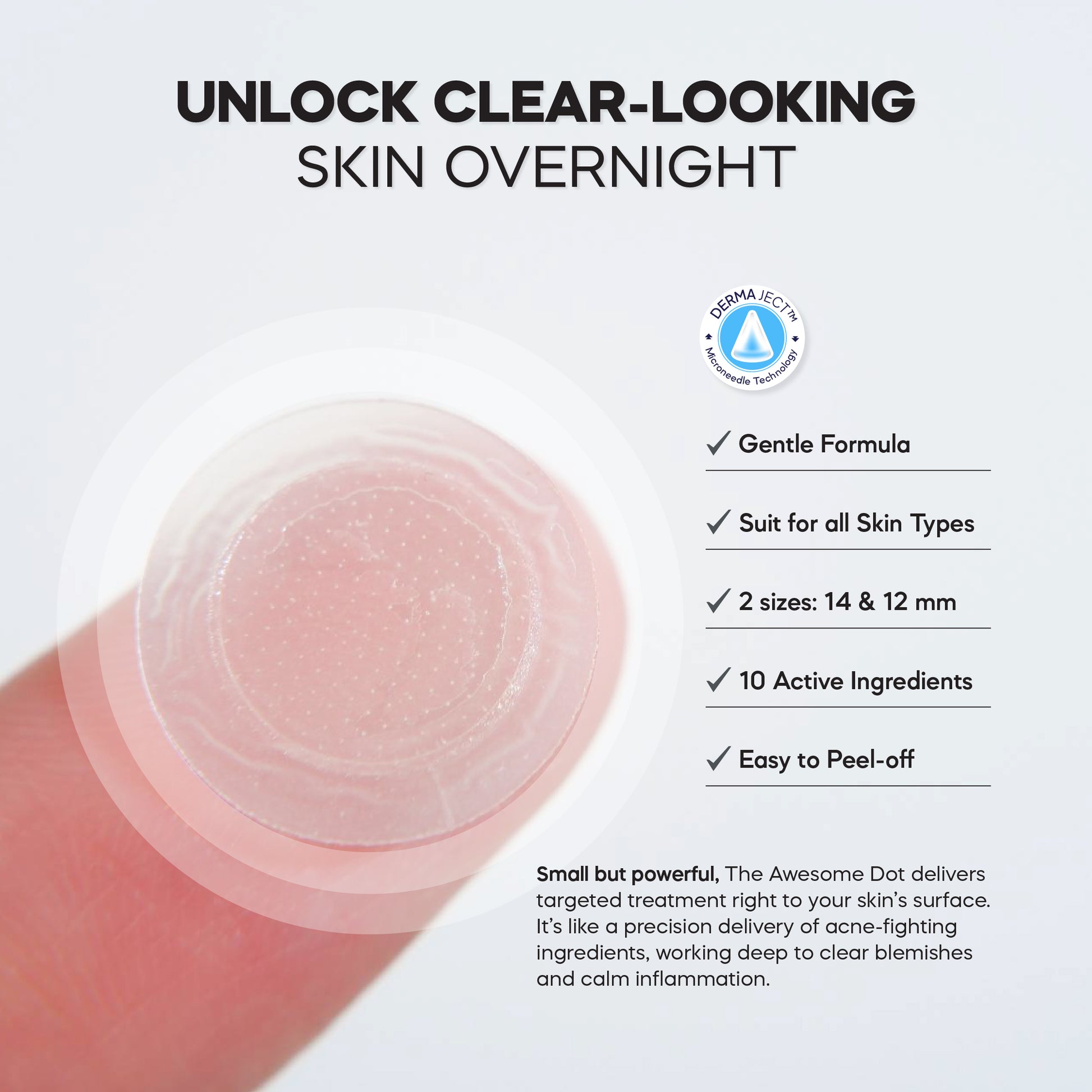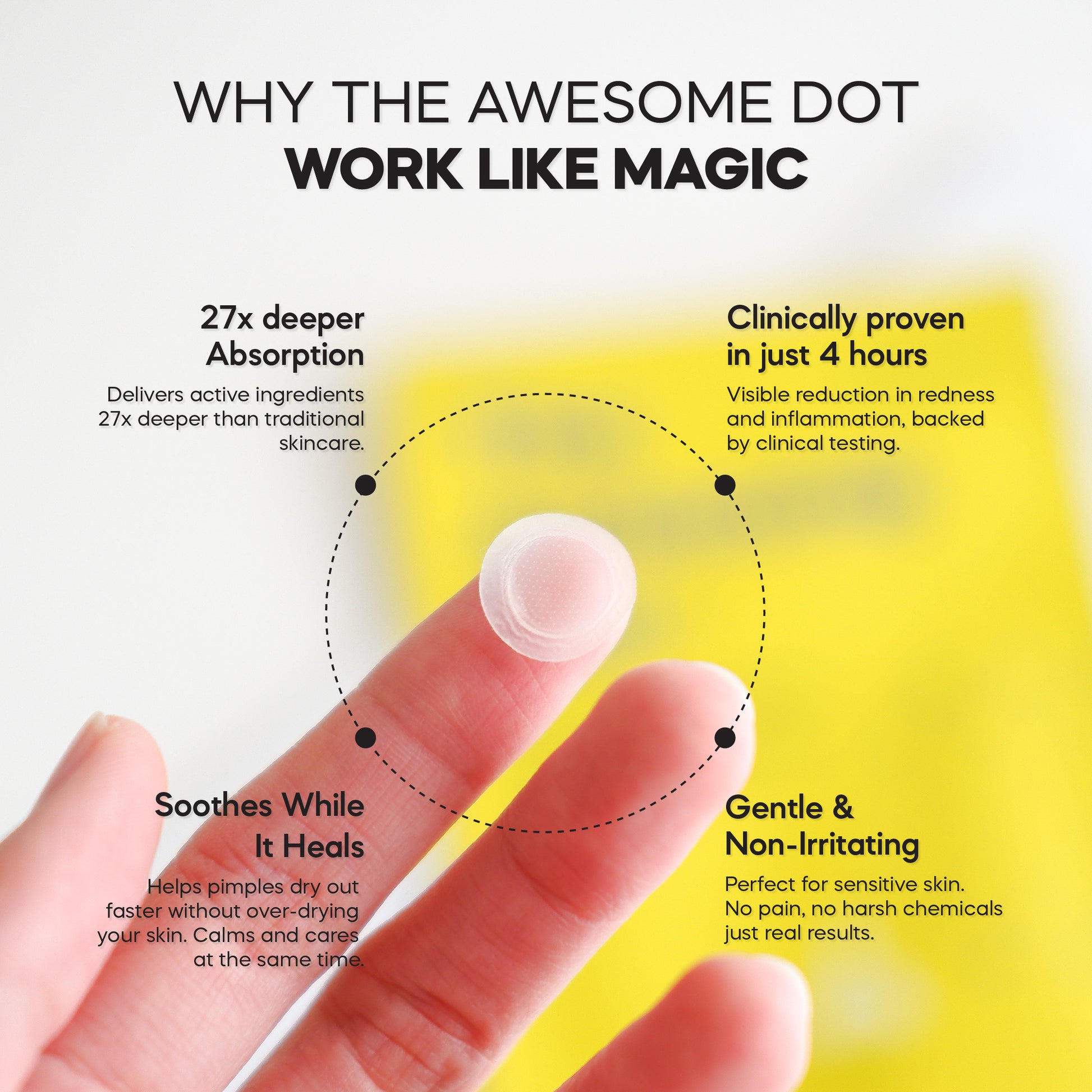 - The Awesome Dot: Clean the breakout with the included Skin Prep Swab, then apply the patch and leave on for 6–8 hours.