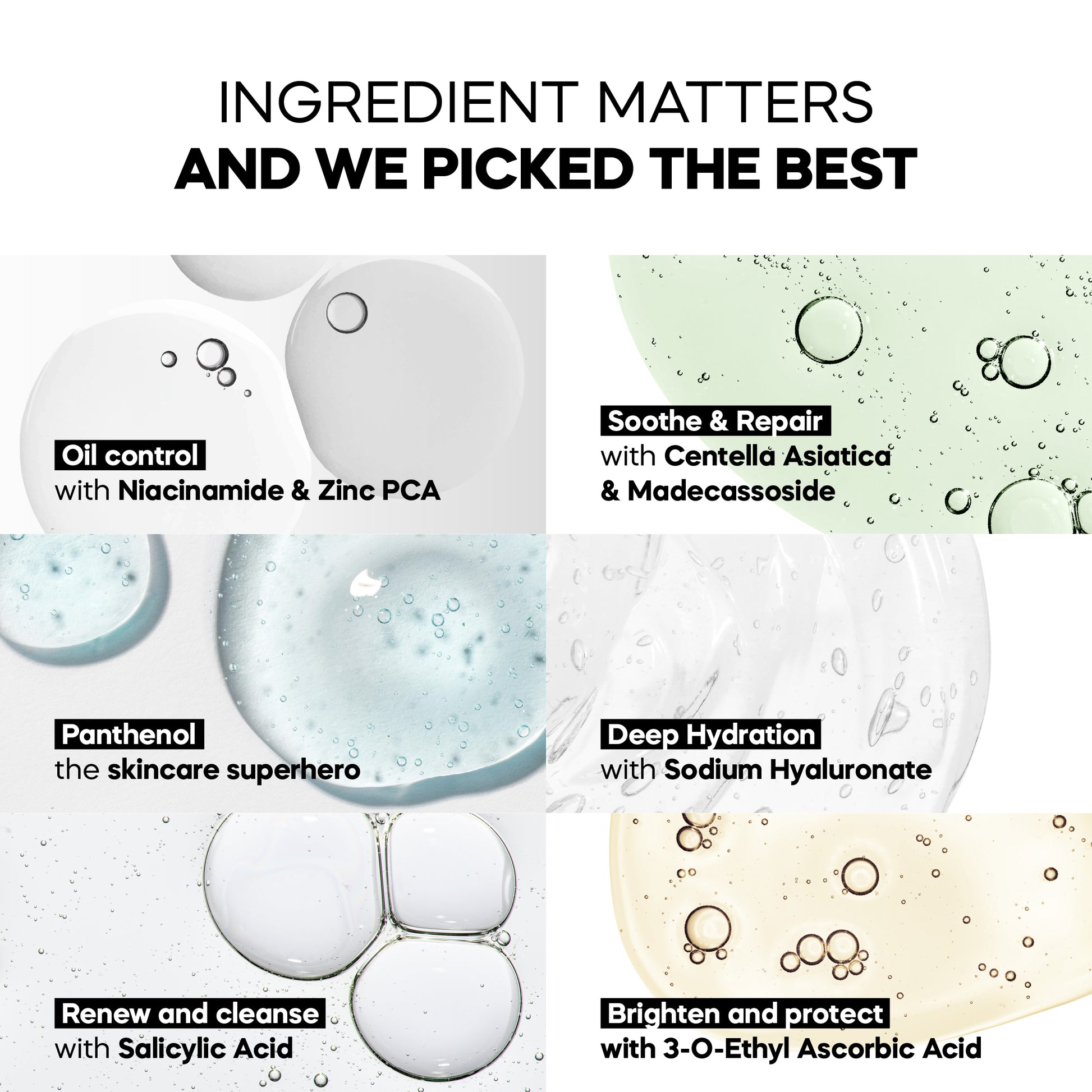 - Proven ingredients: salicylic acid, niacinamide, Centella, zinc